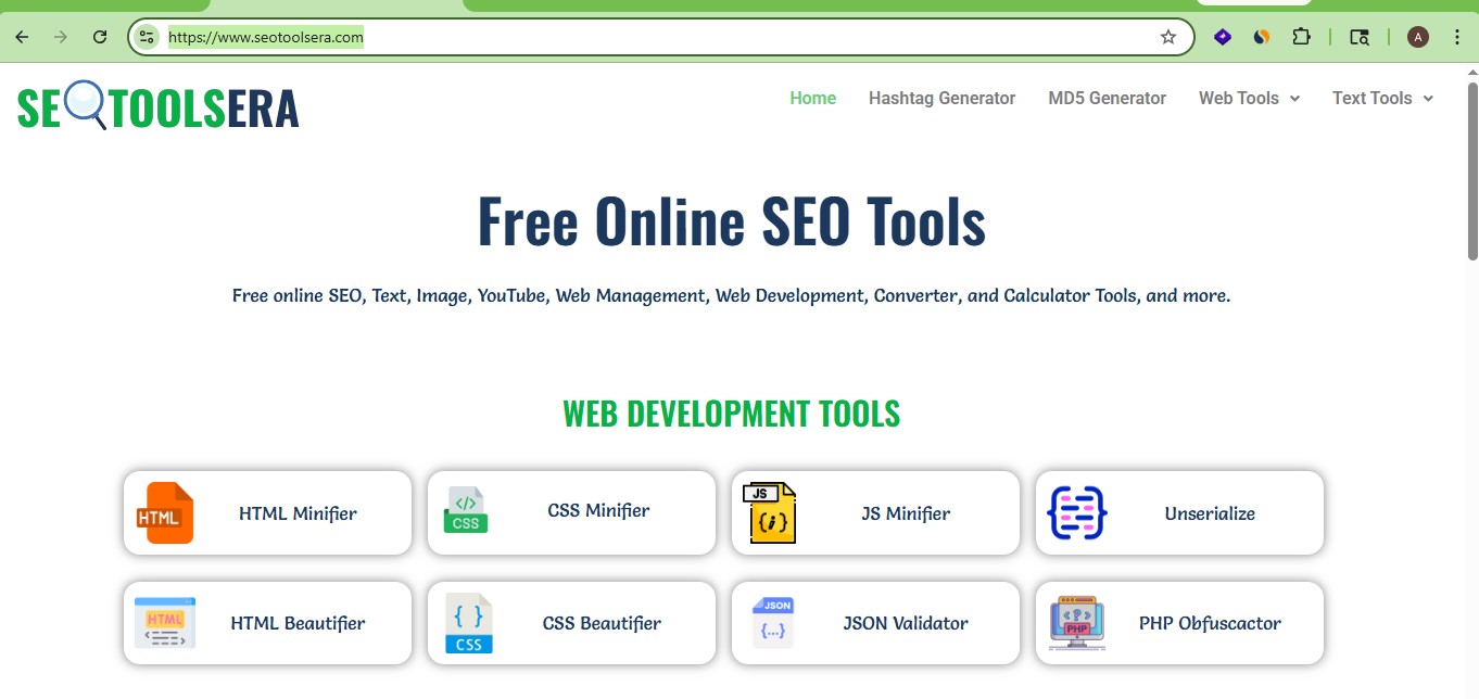 SEOToolsEra is a powerful, user-friendly online platform built to empower website owners, content creators, and digital marketers with a complete suite of free SEO, YouTube, and Webmaster tools. Whether you’re looking to boost your website’s visibility, grow your YouTube channel, or improve your overall digital strategy, SEOToolsEra has everything you need — all in one place.